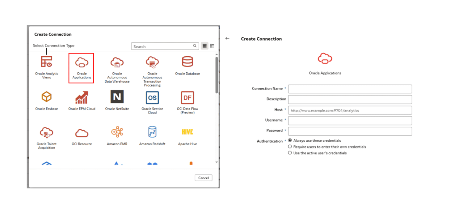 Ce connecteur permet de visualiser directement dans OAC les données provenant des applications de la suite Oracle Fusion Cloud Applications :