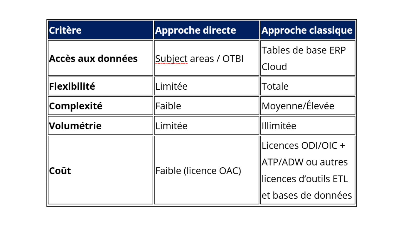 L’approche directe est idéale pour des besoins d’analyses rapides et standardisées, basées sur les rapports ERP Cloud existants. Elle convient aux utilisateurs métiers qui n’ont pas besoin d’accéder aux données brutes ou de réaliser des analyses complexes.